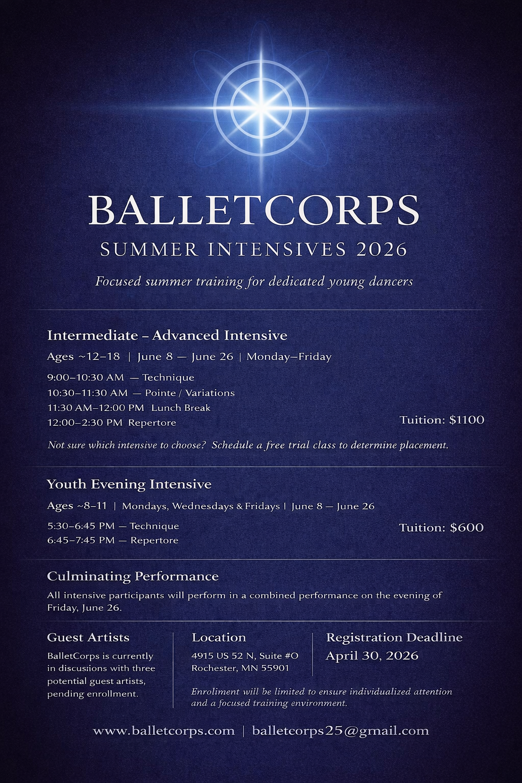 We are thrilled to announce that BalletCorps has secured an exceptional group of guest artists for the 2026 BalletCorps Summer Intensives.